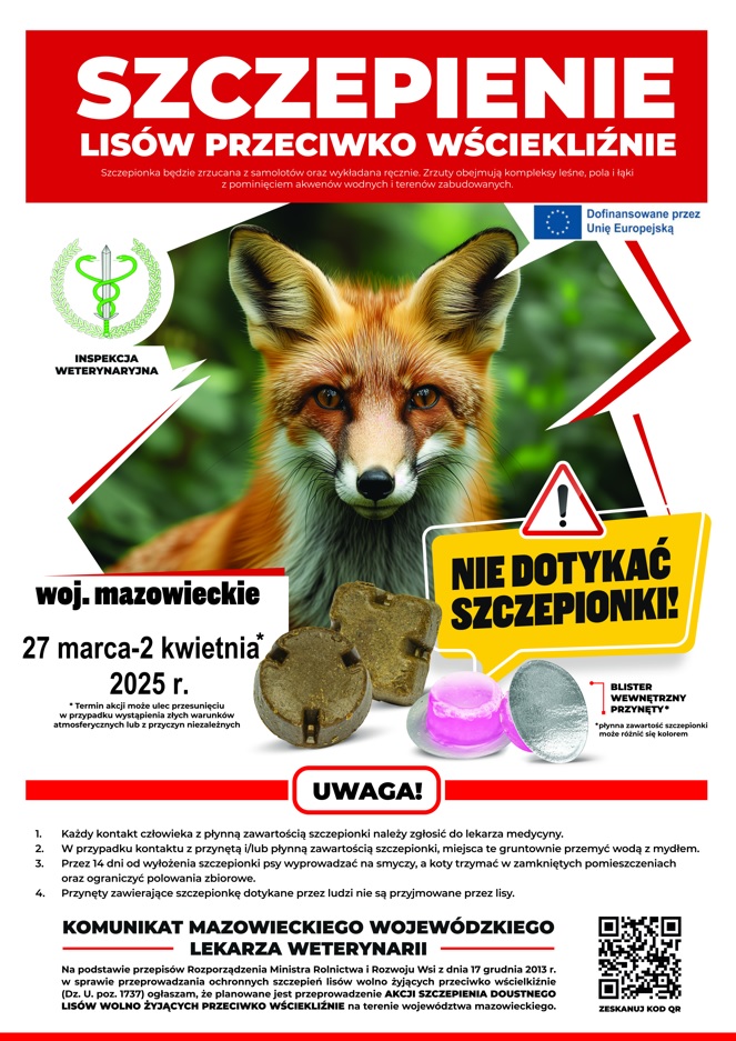 Uprzejmie informuję, że w dniach 27 marca - 2 kwietnia 2025 r. na terenie województwa mazowieckiego zostanie przeprowadzona akcja szczepień lisów wolno żyjących przeciwko wściekliźnie.